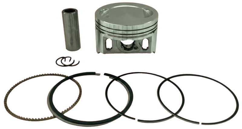 Complete piston kit (piston, rings, pin, clips). Precision machined aluminum piston with chrome rings. Restores power and compression.
